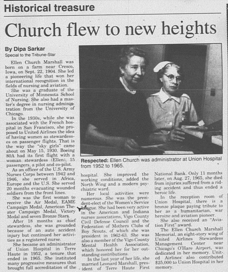 Ellen Church was the first female stewardess for any airline. She won seven bronze stars for saving the lives of wounded soldiers during World War 2. Finally she was the administrator of Union Hospital. -