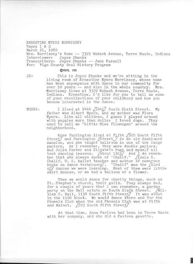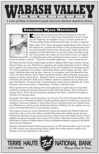 Ernestine Morrissey was a dancer who performed in the Ziegfield Follies and toured around the country. Later she opened a dance studio in Terre Haute and taught generations of children how to dance. -