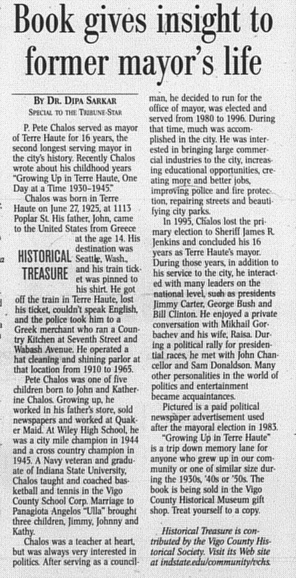 Pete Chalos was mayor of Terre Haute from 1980 to 1996 where he assisted the city in improving services, the economy, and its reputation. -