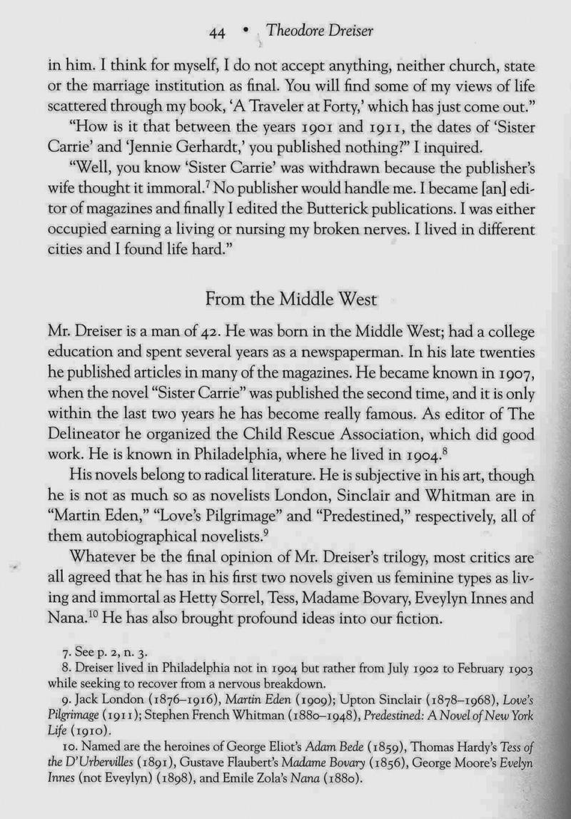 Theodore Dreiser was a great American writer. His novels include "Sister Carrie" and "An American Tragedy". A Nobel Prize winner, Dresier's novels focused on the hardships of modern life, especially for those at the bottom of society. His characters also often lacked a certain moral fiber. -